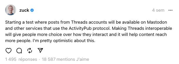 C’est par un message sur Threads que Mark Zuckerberg, himself, a annoncé sa volonté d’arrimer son nouveau réseau social* au “Fedivers” - ce que la Quadrature du Net définit sur son site comme un “ensemble de médias sociaux composé d’une multitude de plateformes et de logiciels, où les uns communiquent avec les autres grâce à un protocole commun”.